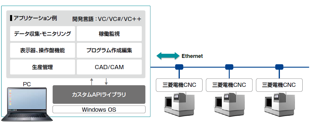 三菱電機数値制御装置と接続し、通信処理などが必要なWindowsアプリケーションの開発を容易にするAPI関数群を備えたソフトウェア製品です。