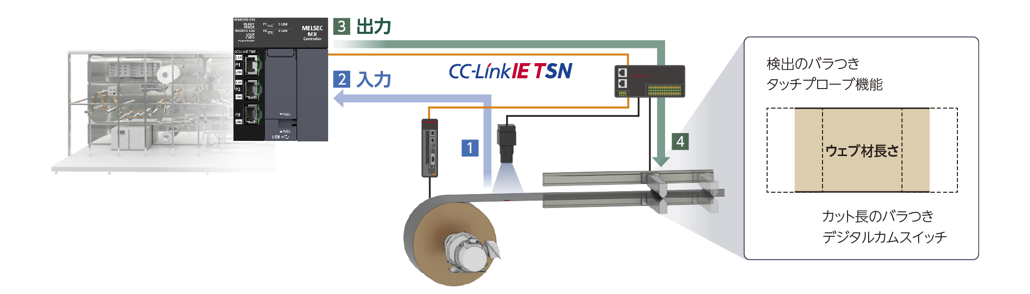 ロールtoロールなどの高速かつバラつきのないI/O制御を必要とする場合でも、コントローラのスキャンタイムに依存しない入出力がネットワーク経由で実現できます。マークの検出とカッティングの入出力タイミングの誤差(ジッタ)が小さいため、ウェブ材の検出とカット長のバラつきを低減できます。高速でワークが流れる製造ラインの歩留まりを向上できます。