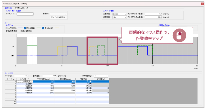 カムデータの作成やパラメータ設定が視覚的にわかりやすく、複雑な多軸同期プログラムをイメージして作成できるため、ローコードで作業の効率が向上します。
