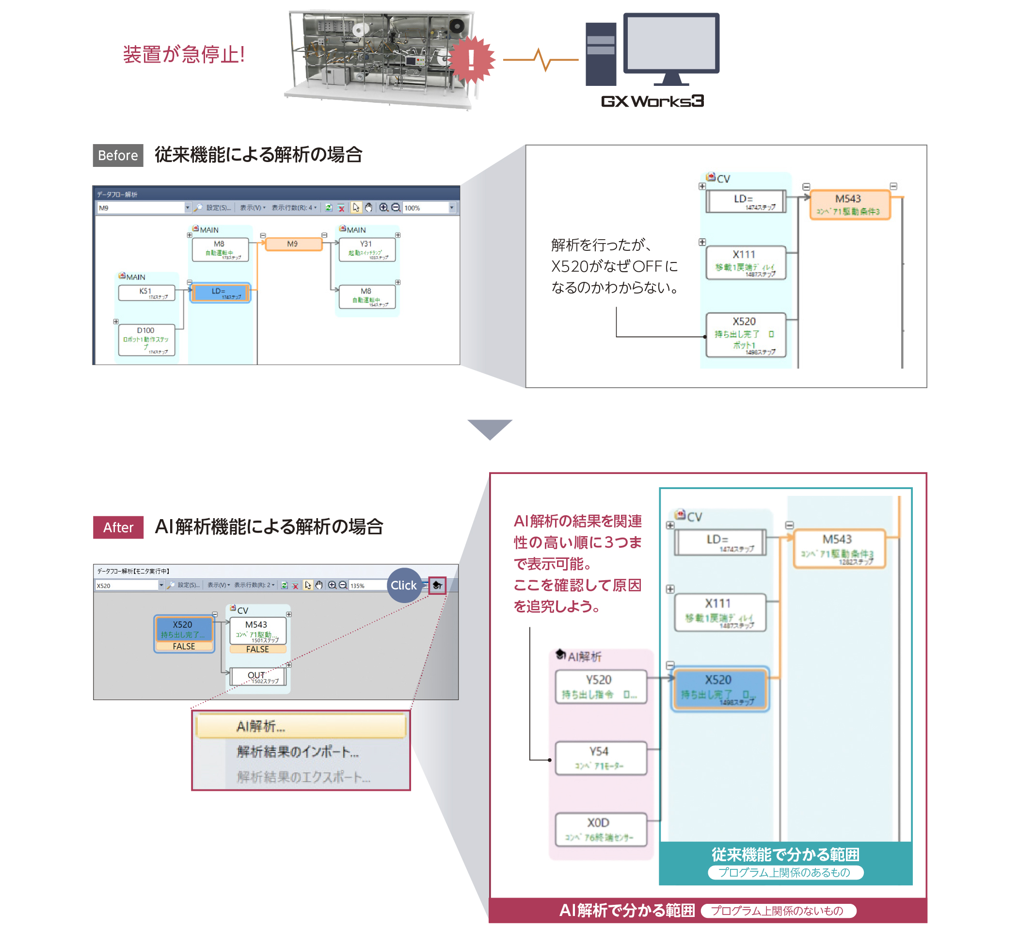プログラム上では分からないデバイスの関係性をAIで追跡できます。プログラム上は問題がないのに装置が停止する「ダンマリ停止」の原因に対して、AIを活用したデータフロー解析で効率よくデバッグできます。AI解析には、設備/装置の正常稼働時に取得したレコーディング/ロギングファイルが必要になります。