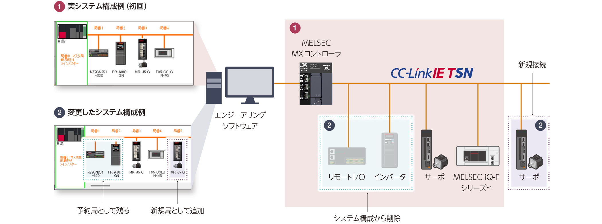 エンジニアリングソフトウェアをマスタ局につないで、画面上のボタンをクリックするだけで実機のシステム構成が自動検出され、ネットワークパラメータが自動生成されます。またシステム構成を変更した場合でも同様の操作で簡単にパラメータ変更ができます。これにより、ネットワークの立上げ時間を短縮できます。