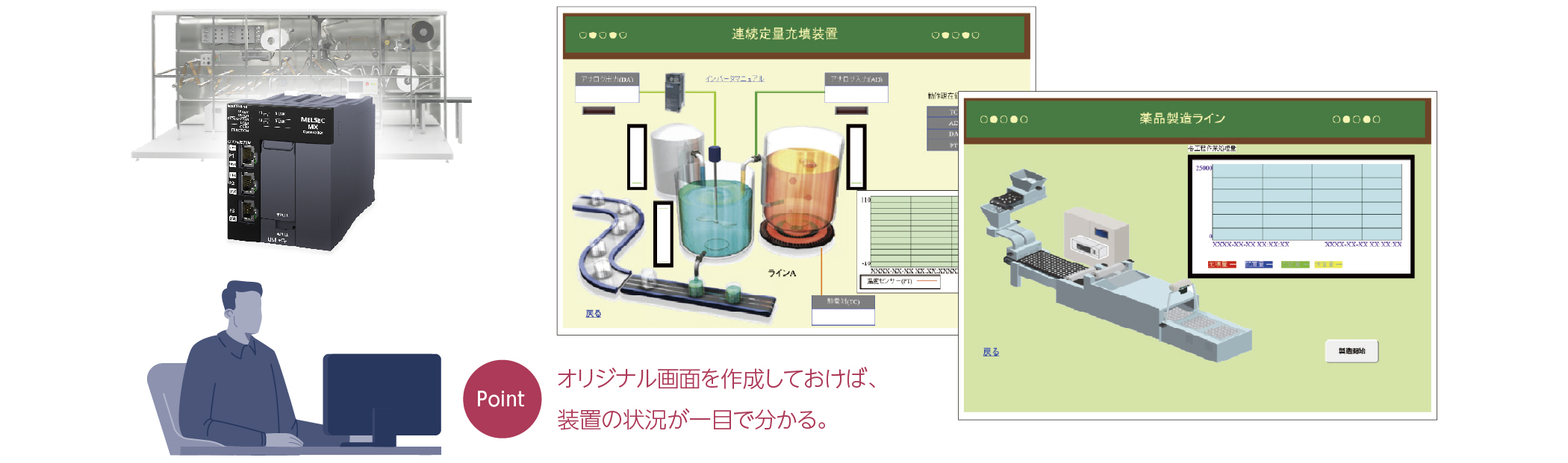数値やグラフ、画像などを使用してユーザ独自のWeb画面を作成できるため、設備の稼働状況を確認するモニタ画面として活用できます。