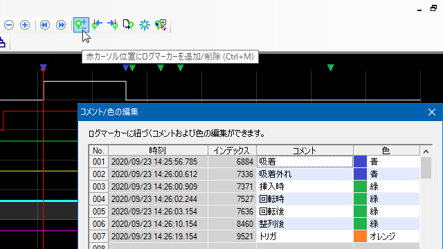 ログマーカ機能は、トレンドグラフの気になる箇所へマーカを追加でき、コメントの追加や色を変更できます。
