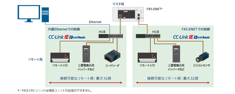 IEフィールドネットワークBasicのマスタ局機能が内蔵されています。また、FX5-ENETを増設することで、さらに多くの機器を接続可能です。