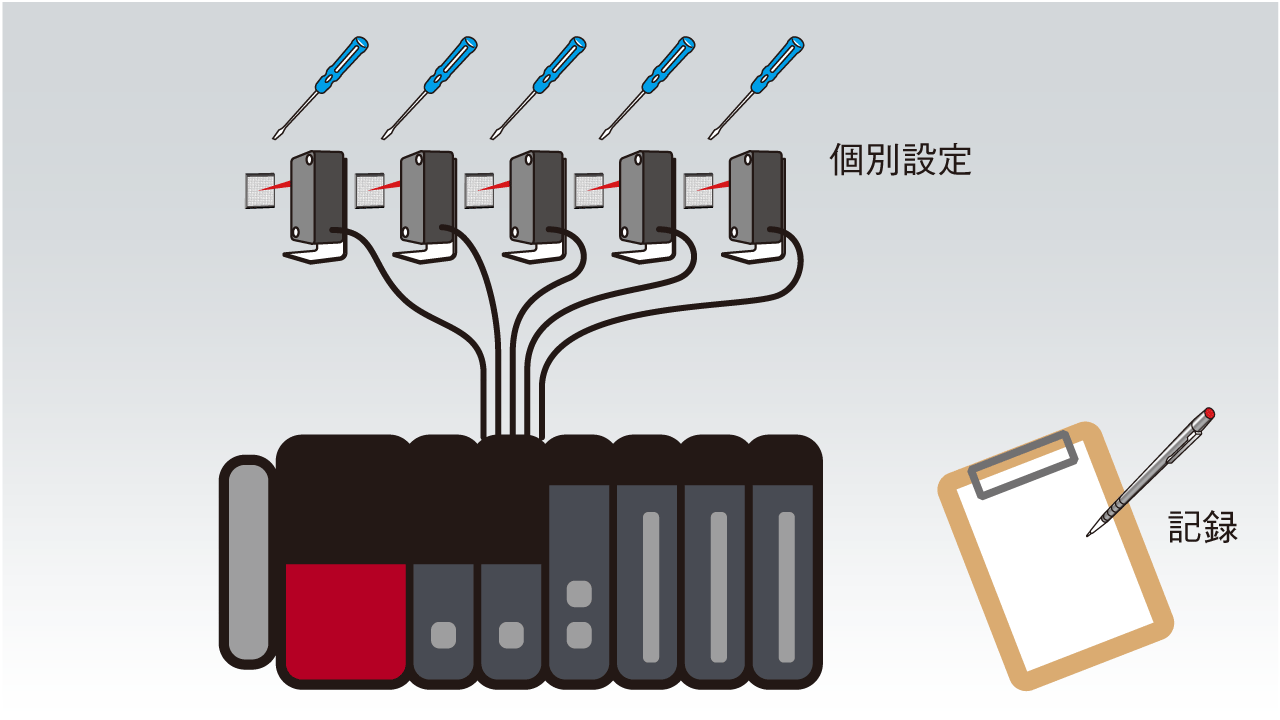 一般のセンサでは、複数のセンサに対して1台ずつ調整が必要。