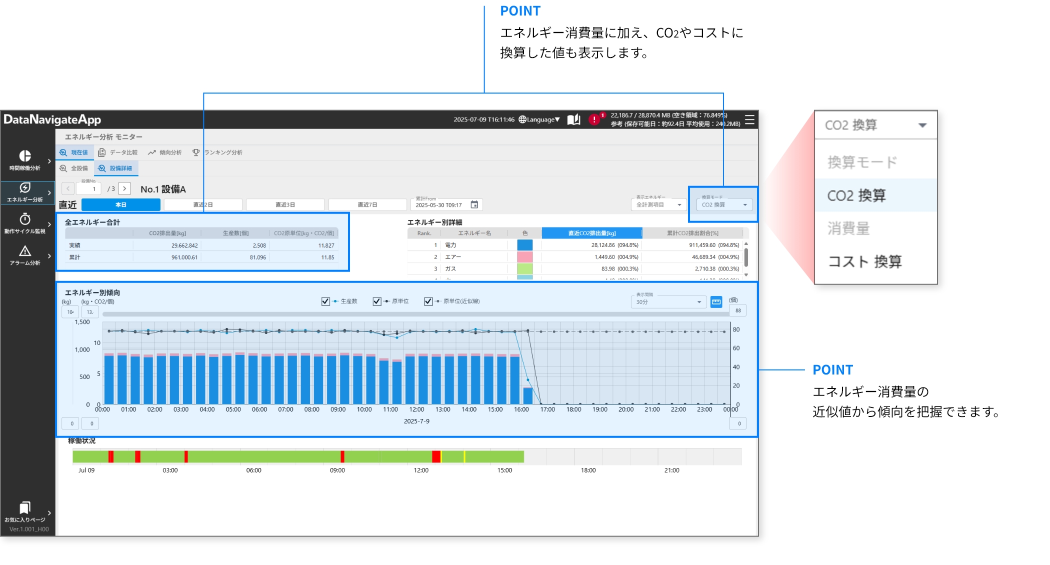 電力量、エアー流量などの設備のエネルギー消費量を、設備の稼働状態等と紐づけて可視化・分析するアプリです。