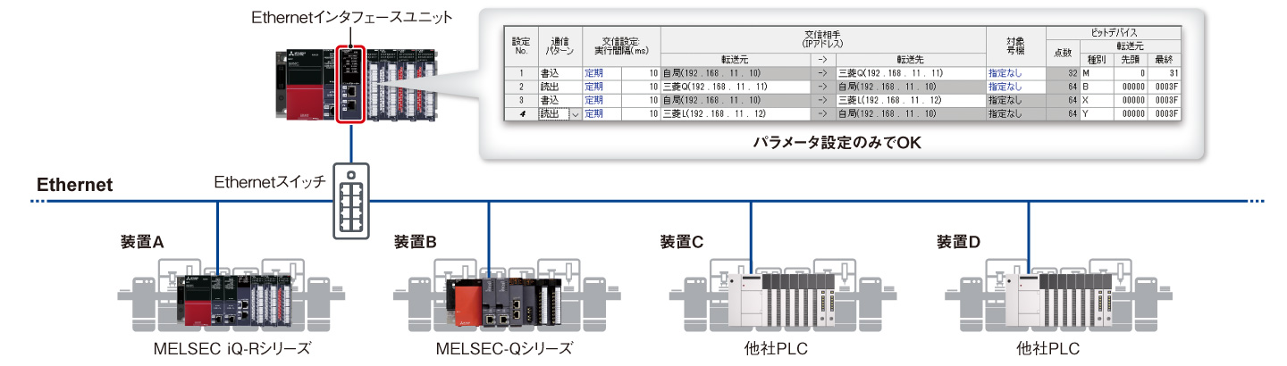 - Ethernetインタフェースユニットを使うと、パラメータ設定のみで、当社シーケンサだけでなく既設の他社PLCともデバイスデータのやり取りができます(シンプルCPU通信機能)*2