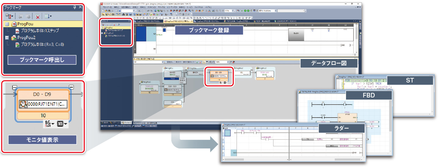 撮影した映像の確認したい瞬間にしるし(ログマーカー)をつけて、GX Works3(回路モニタ)およびGX LogViewer(波形表示)と連携することで、簡単に解析作業ができます