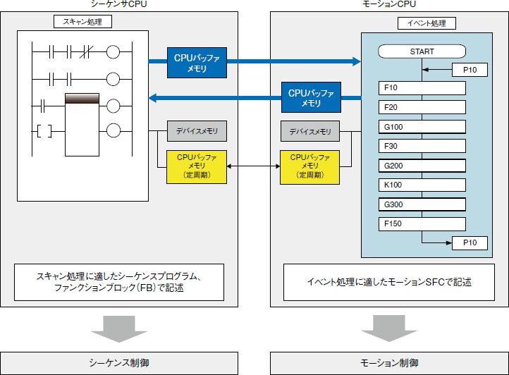 シーケンサCPUとモーションCPU間にCPUバッファメモリがあり、2種類の用途に使用することができます。
