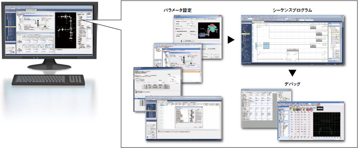 1つのエンジニアリングツールでシンプルモーションユニット、サーボアンプを使ったサーボシステムのプログラミングからデバッグまで対応できます。
