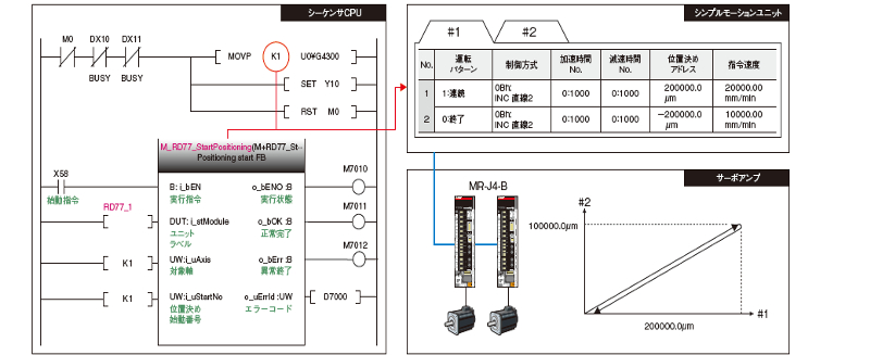 シーケンスプログラム、ファンクションブロックからバッファメモリへ位置決めデータを書くだけで、直線補間などを簡単に実行可能です。