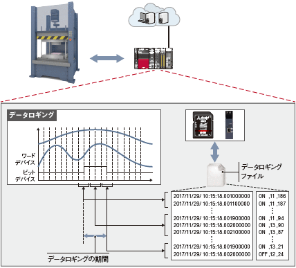 データロギング機能は、エンジニアリングツールから書き込んだロギング設定(トリガ条件やデータ収集条件)に基づき、モーションユニットのデータを指定の間隔で収集し、結果をデータロギングファイルに保存する機能です。