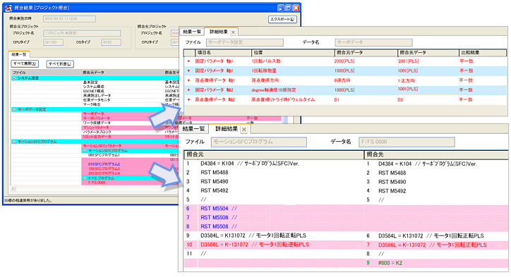 現在開いているプロジェクトと保存してあるプロジェクトのデータを照合し、照合結果をわかりやすく表示します。