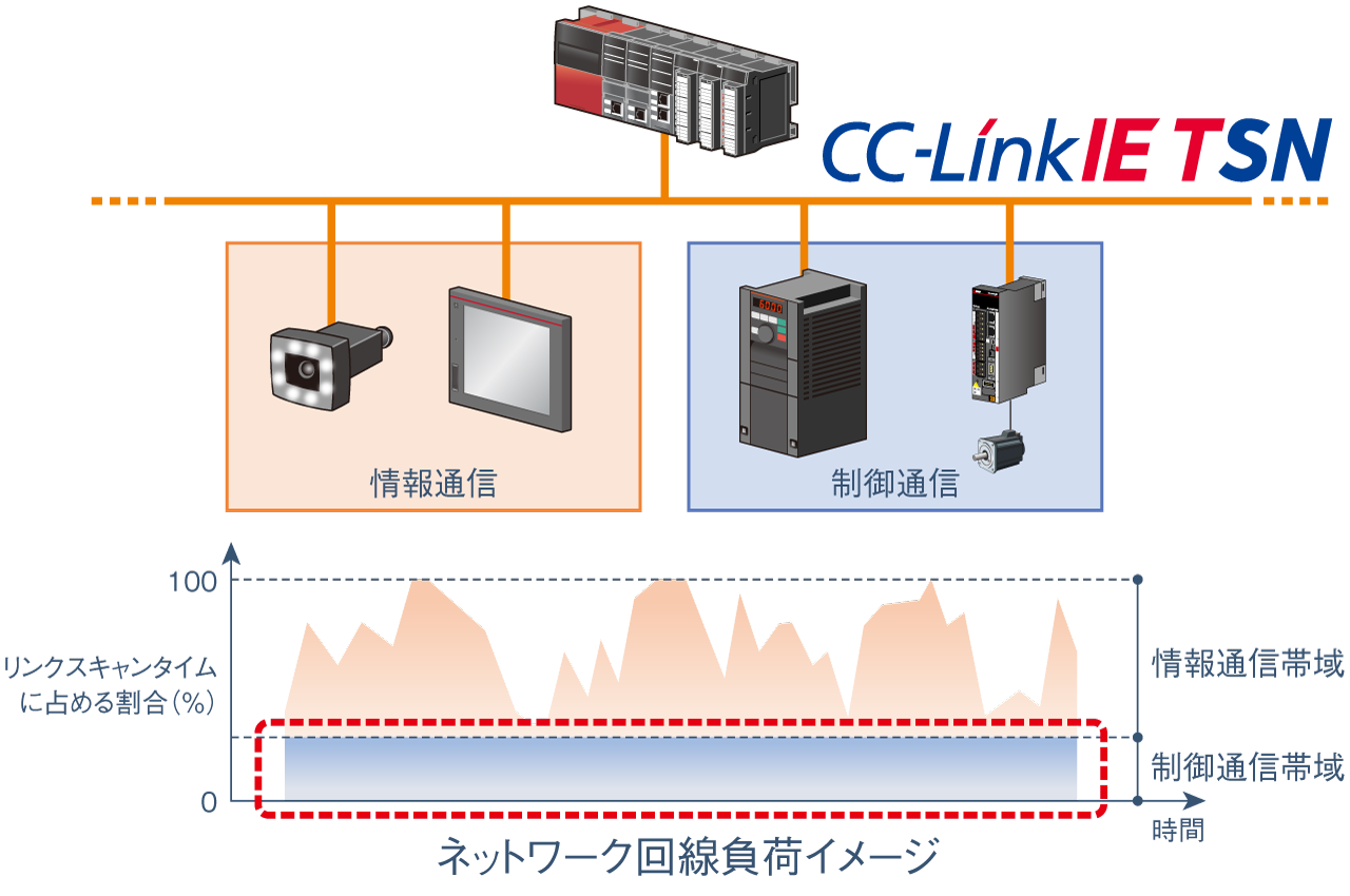 CC-Link IE TSNでは、サイクリック通信でリアルタイム性を保証した制御を実施しながら、ITシステムとの情報通信が混在可能です。