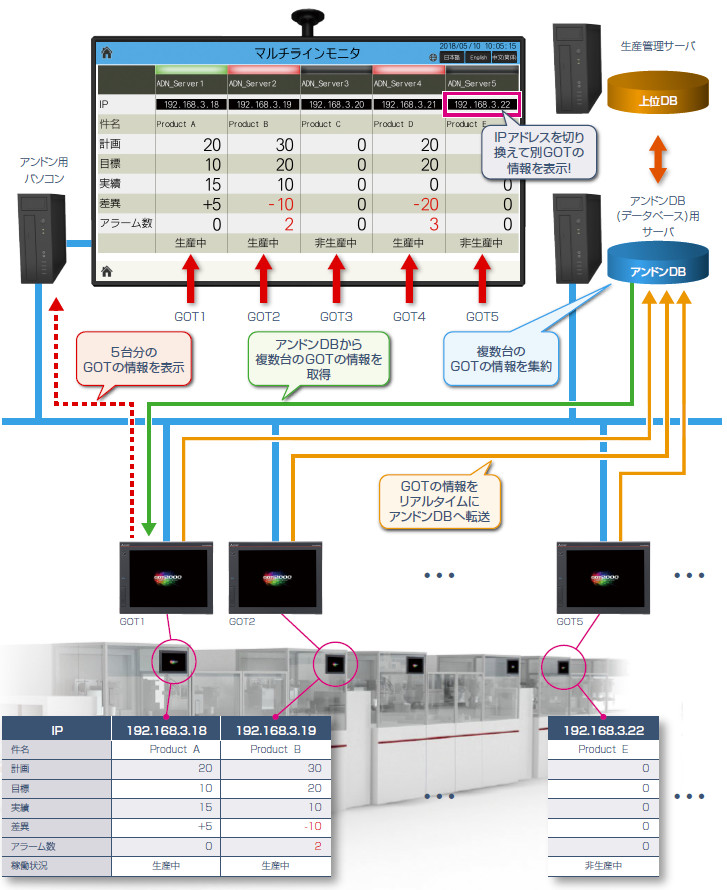 アンドンDB(データベース)で複数ラインの生産情報をリアルタイムに収集し、GOTがアンドンDB(データベース)から取得した複数台分のGOTの情報を、アンドン用モニタに表示できます。また、アンドンDB(データベース)のストアドプロシージャ機能を利用することで、上位の生産管理サーバとの連携*も可能です。