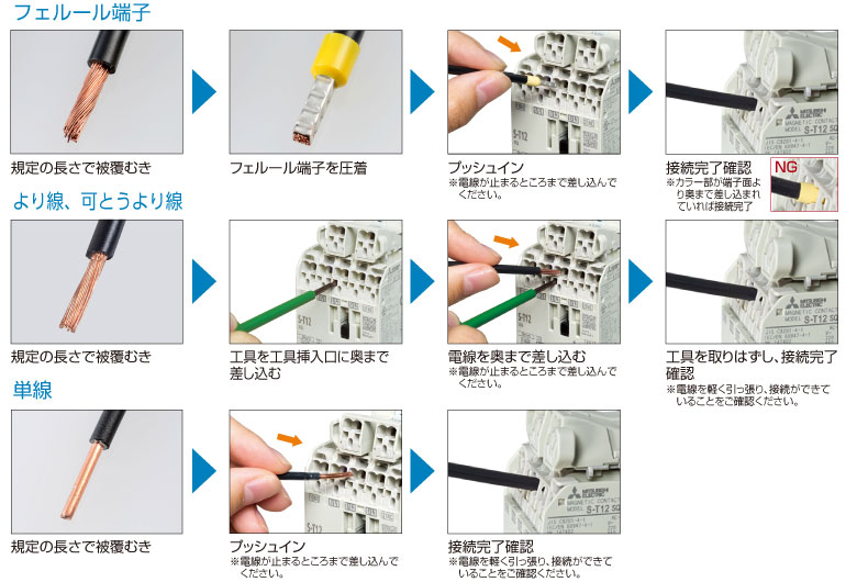 単線、フェルール端子は差し込むだけで接続が可能です。より線の場合でも、工具によりスプリングを開いて電線を挿入し、工具を抜くだけで接続が可能です。