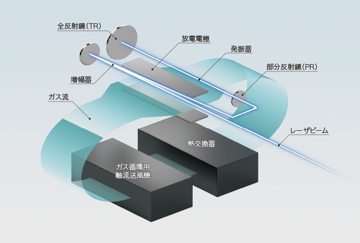 CFRPを高品位・高速に加工するため、発振器と増幅器を同一筐体に統合したCO2レーザ発振器を開発。急峻なパルスと高出力の両立を三軸直交形で達成。