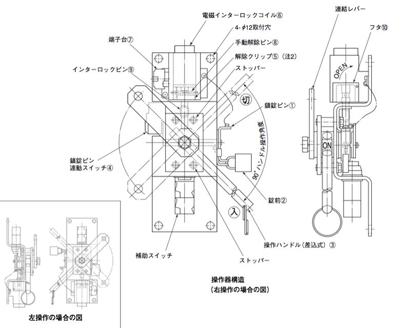 - 3.出荷時は、断路器本体、手動操作器共に右操作用に調整していますが、左操作用への調整変更が容易にできます。