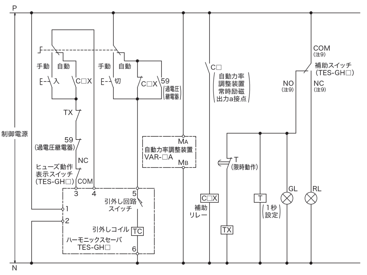 開放してから1秒後に入指令による投入動作が可能になります。 - 7.本接続図は、ハーモニックスセーバが開放状態を示します。