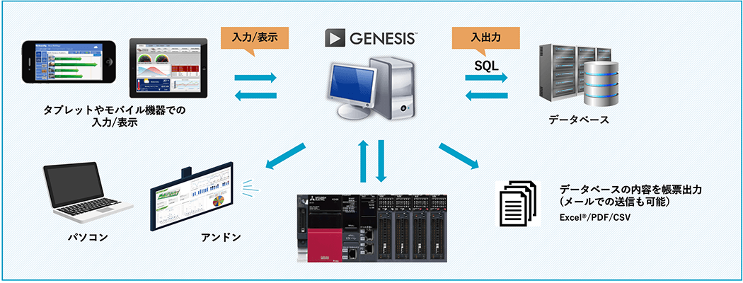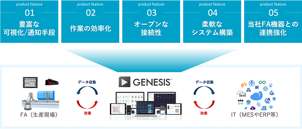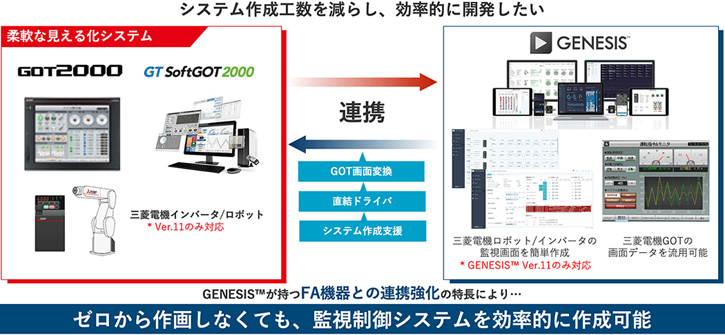 タグやクライアントなどの制限なくデータ取得・監視ができるようになり、三菱電機製FA機器との接続性を強化したGENESIS™ バージョン11。システム拡張や複数拠点監視など、柔軟なデータ活用システムの構築を可能にします。