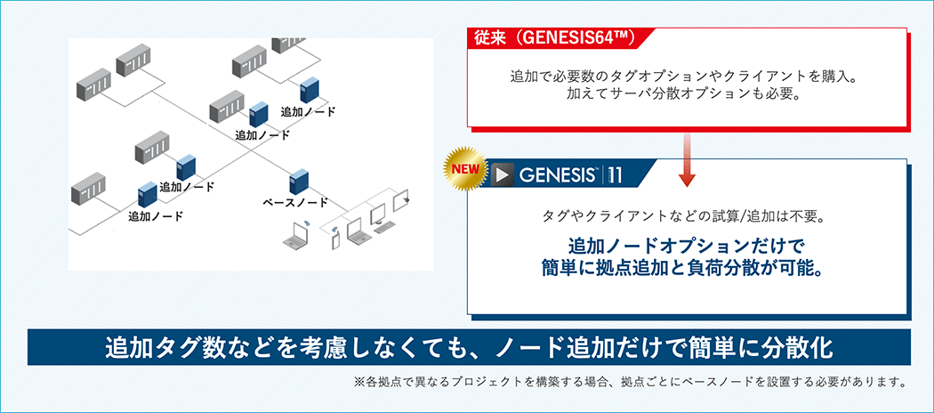 追加ノード設置により「①拠点追加」「②システム拡張時の負荷分散」が可能です。