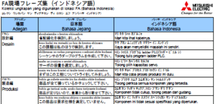 生産現場でよく用いられるフレーズを場面別(設計・製造・保守等)に整理し、FA現場フレーズ集に纏めました。現地スタッフとのインドネシア語、英語他でのスムーズなコミュニケーションの一助としてご利用ください。
