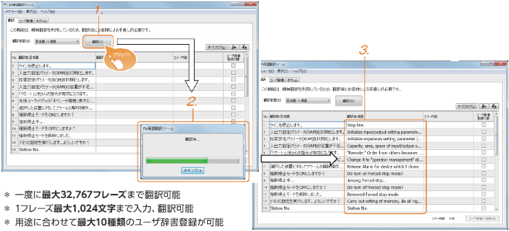 iQ Worksで作成するグローバルラベル、GX Works2・GX Works3、GT Works3などのラベル/コメント(単語、文章)などを複数まとめて翻訳(対応言語:日本語・英語・中国語)し、翻訳内容を反映できるソフトウェアです。