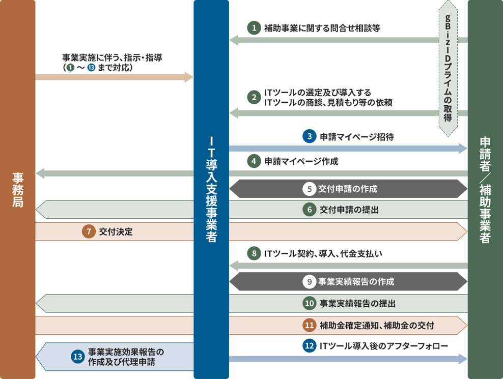 IT導入補助金事務局に採択されたIT導入支援事業者(ベンダー)から購入するITツールが補助金の対象となり、補助事業者が交付申請し採択された場合、補助金の交付を受けることができます。