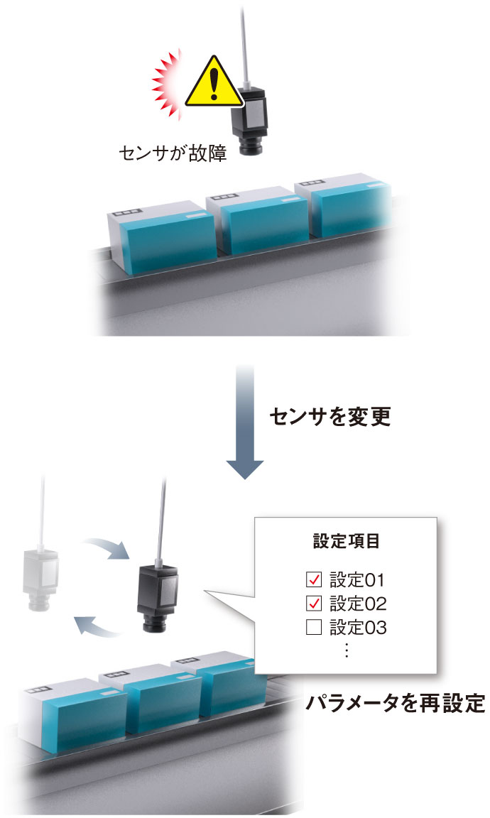 1つのラインで複数の製品を生産する場合、製品が変わるたびにセンサのパラメータを設定する必要があり、段取替えに時間がかかる。