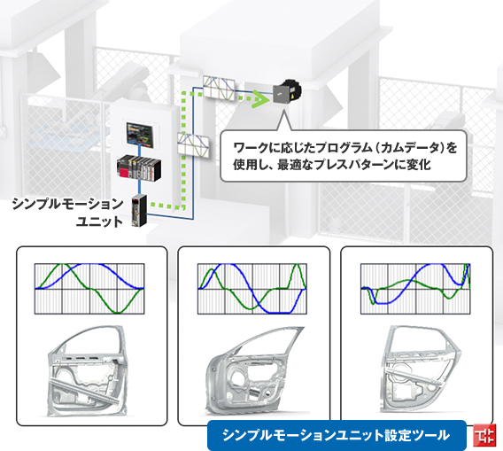 | 複数のプレスパターンを使い分けて金型変更時にかかる段取り替え工数を削減したい | 様々なパターンのカムデータを作成し、プレスパターンを状況に応じて変化 |