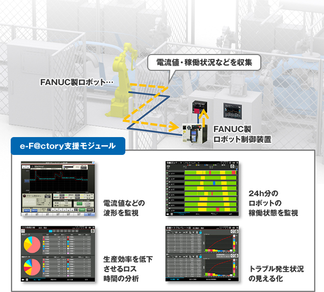 | 溶接ロボットの稼働状態を監視し、稼働率を向上したい | e-F@ctory支援モジュールでロボットの稼働状況、トラブル要因を明確化 |