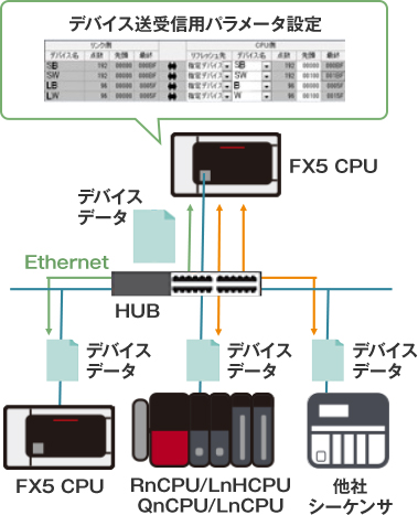 - 上位工程と後工程のPLC間に内蔵Ethernet経由で、簡単なパラメータ設定だけでマルチPLC間データ共有ができ、コスト削減を実現します。
