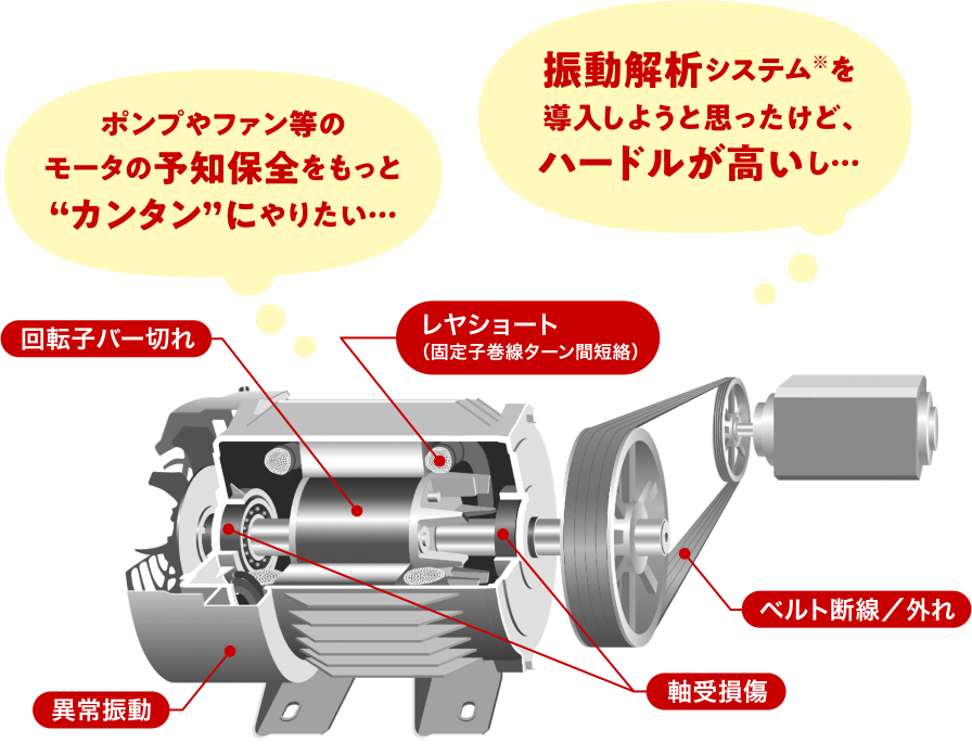 クランプ式CTの採用により、既存設備の配線を変更することなく設置可能。専用の機械式振動センサを取り付けるといった、特別な電気工事などは不要です。